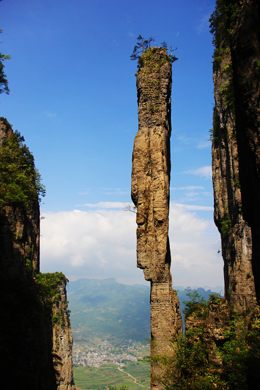 一炷香是地球上稀有的单体三叠系灰岩柱,高度为150米,柱体底部直径6米,最小直径只有4米,此地的岩石的抗压强度是800千克每立方厘米,风吹他不倒,雨打他不动,傲立群峰之中千万年,守护着这片神秘的土地,实属罕有。他近观犹如男根,展示着他威武的雄姿,俨然成了大峡谷中的镇谷之宝。相传,这根石柱是天神送给当地百姓的一根难香,如遇灾难将他点燃,天神看到寥寥青烟,就会下凡来救苦救难,所以当地百姓称它为“难香”,这难香又长又细,晴空万里时,一朵白云叠在峰顶,远远看去就像天上的香火,宛若仙境;阴雨天气时,升起的一层薄雾,就像一缕青纱,将它打扮得若隐若现,妩媚动人。从地质学上讲,由于长江水系、清江水系长期交错的影响,不断地侵蚀,不断地冲刷,才形成如今陡峭的石柱,由于保存极度困难,所以地球上类似细长的石柱并不多见,而最长最大的莫过于此。